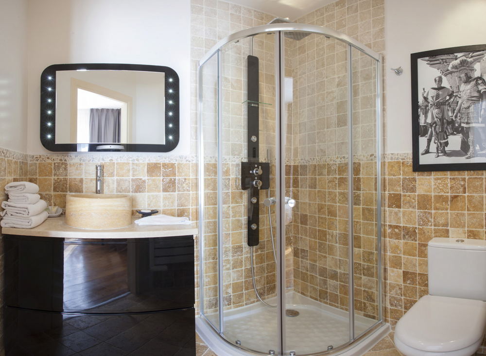 Le décorateur a su exploiter au mieux la surface réduite de la salle de bain de ce petit studio dans lequel les wc ont trouvé leur place